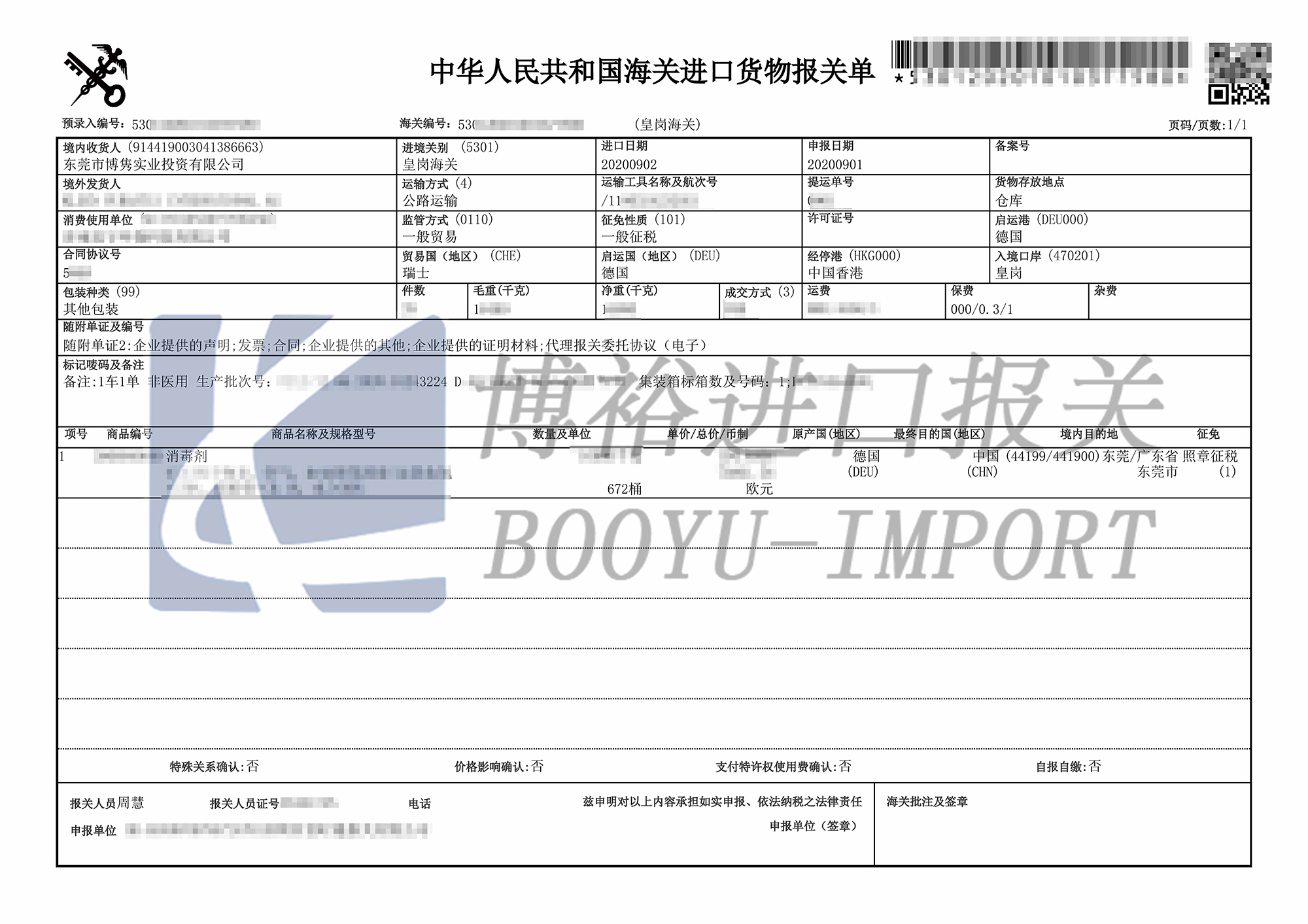 消毒劑進口企業的進出口經營權、消毒劑原產地證書、消毒劑的中文成分表、MSDS中文報告、裝箱單合同等、產品信息:品名、數量、包裝、重量及體積等。